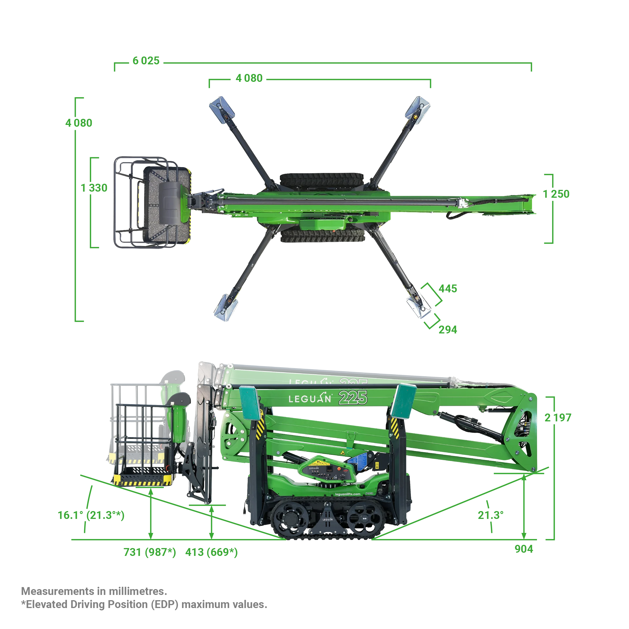 Équipée d’un système de stabilisation automatique, d’une double motorisation thermique et électrique, et d’un contrôle par joystick, la Leguan 225 combine efficacité, polyvalence et confort d’utilisation pour les professionnels.